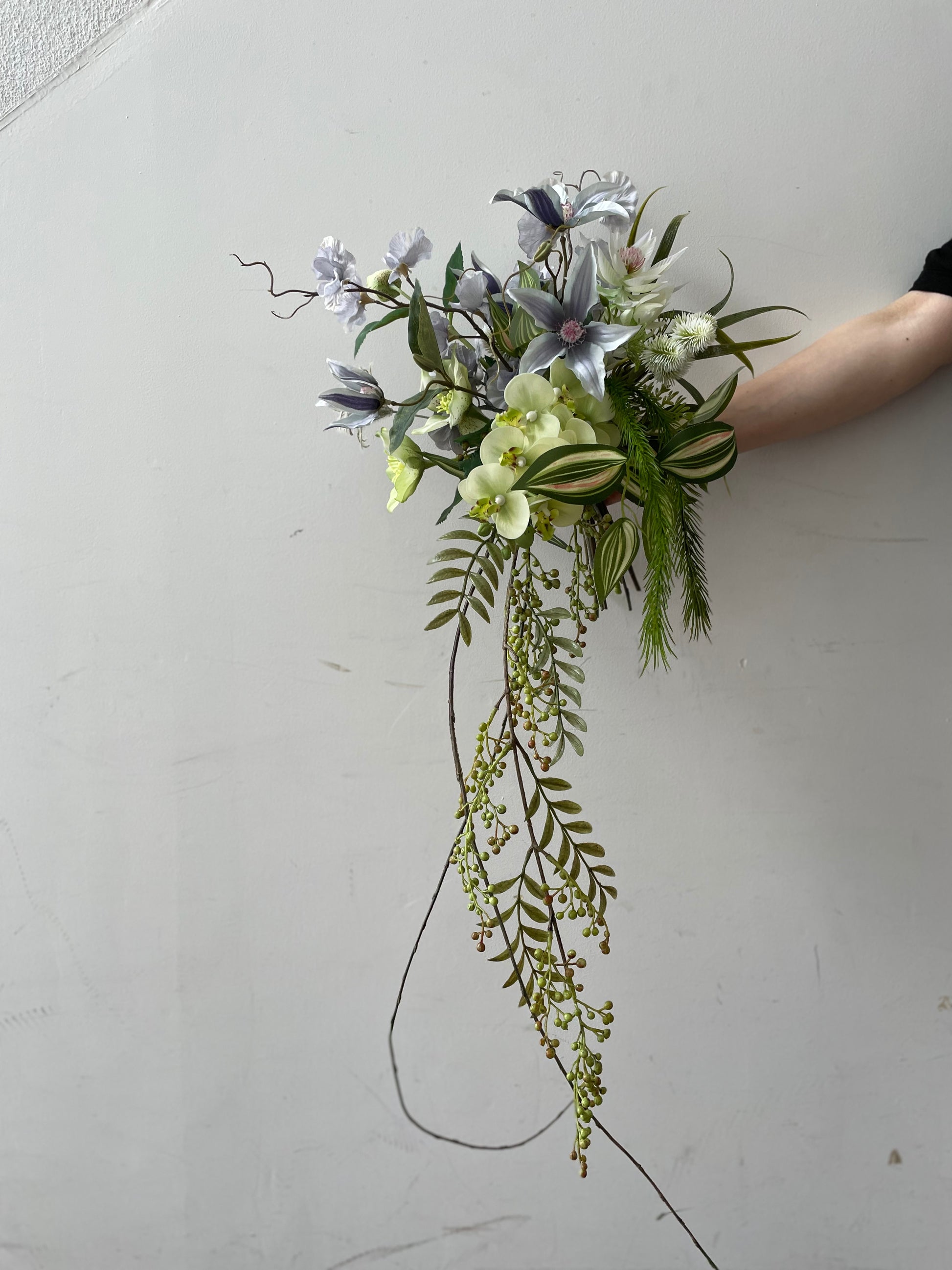 紫、グリーンをメインにアーティフィシャルフラワーを使ったキャスケードブーケです